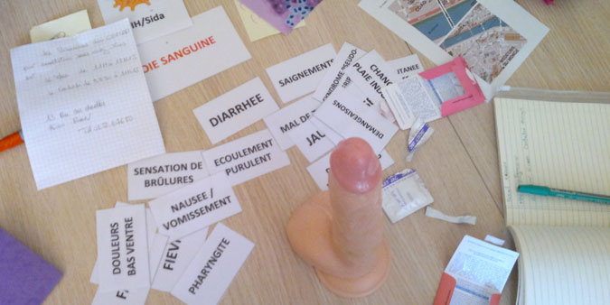 Mercredi matin, 10h00. Marie* arrive dans mon bureau pour papoter, comme à son habitude. La pochette du jeu sur les infections sexuellement transmissibles (IST) traîne sur la table – c’était en quelque sorte préparé. Marie, qui était venue avec moi en décembre dernier à l’occasion des journées mondiales de la lutte contre le sida, le connaissait déjà. Je lui demande si je peux m’entraîner en anglais avec elle. Elle accepte de devenir mon cobaye !