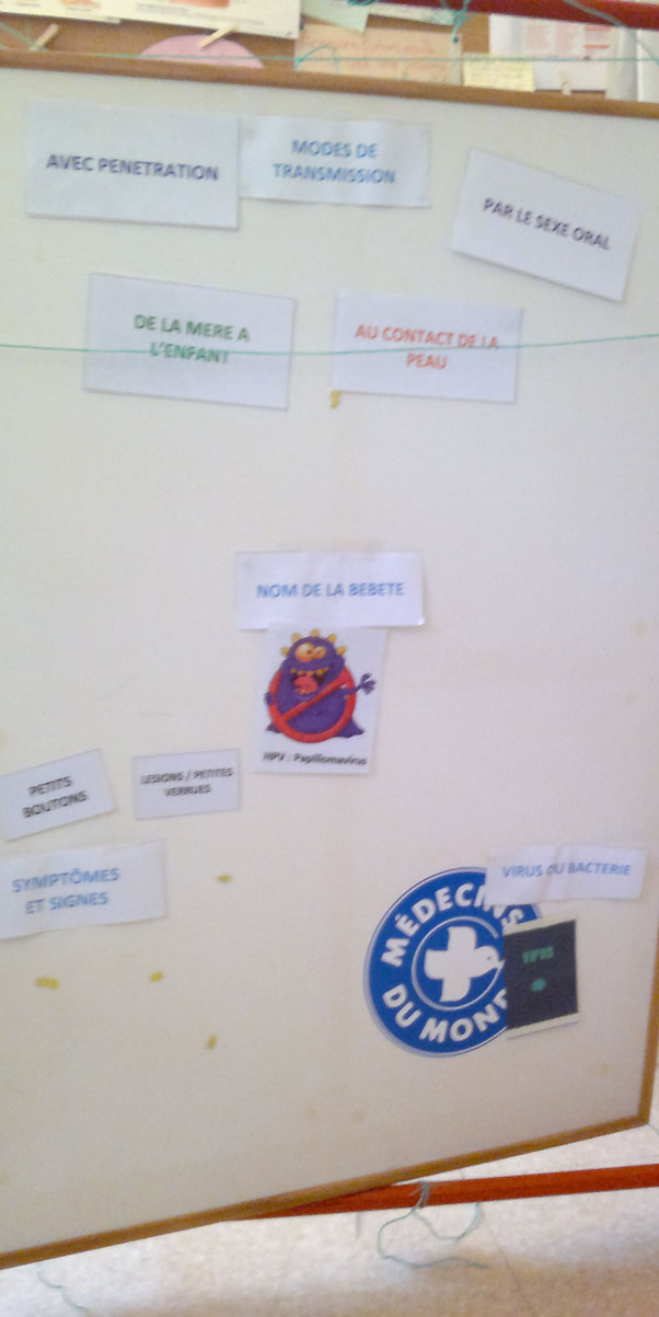 Je propose à Marie de piocher une IST au hasard ; cela symbolise la prise de risques. La jeune femme attrape un papillomavirus (ou HPV) ! Elle colle la vignette-IST sur le tableau et nous commençons à réfléchir ensemble. Quels sont les modes de transmission (pénétration, sexe oral, sang, mère à enfant…) ? Quels sont les signes ? Les symptômes ? Est-ce un virus ? Une bactérie ? Souvenez-vous de vos cours de SVT !