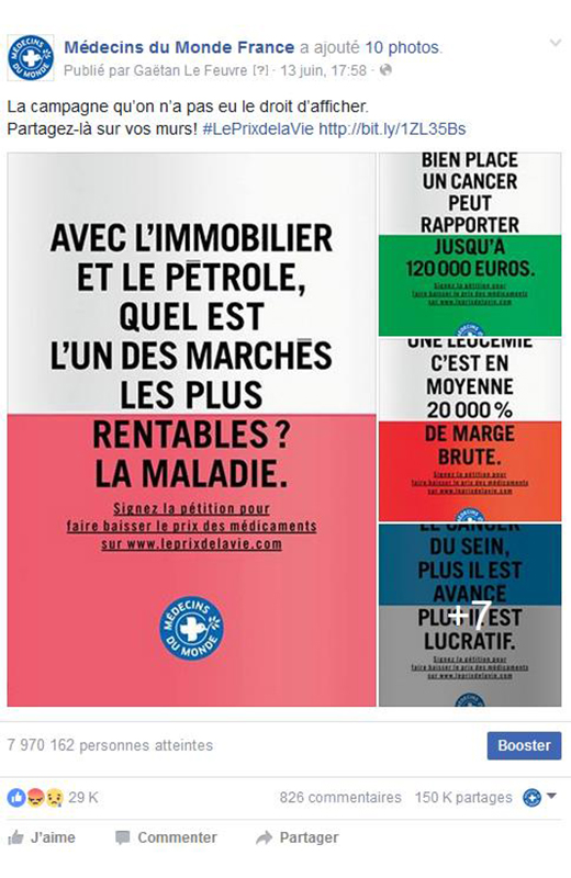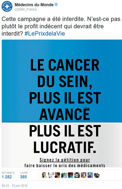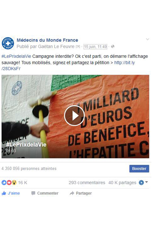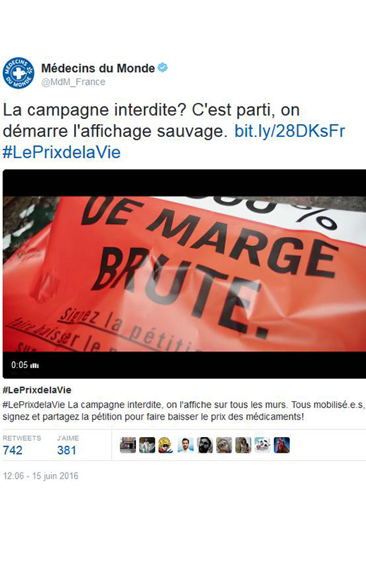 Initialement, le lancement de notre campagne Le Prix de la Vie qui dénonce le prix exorbitant des médicaments était prévu le 31 mai. Décalée au 13 juin à cause du refus du réseau d’afficheurs de Paris, elle déclenche une mobilisation inespérée sur les réseaux sociaux et dans la presse.