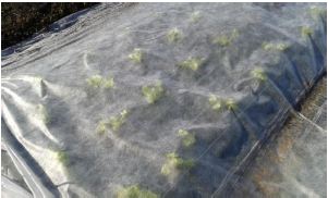 Installer les bâches percées régulièrement en fonction du légume attendu (tout les 75 cm pour les courgettes, tous les 50 pour le céleri, 15 pour les oignons mais 30 pour les salades, etc.)
