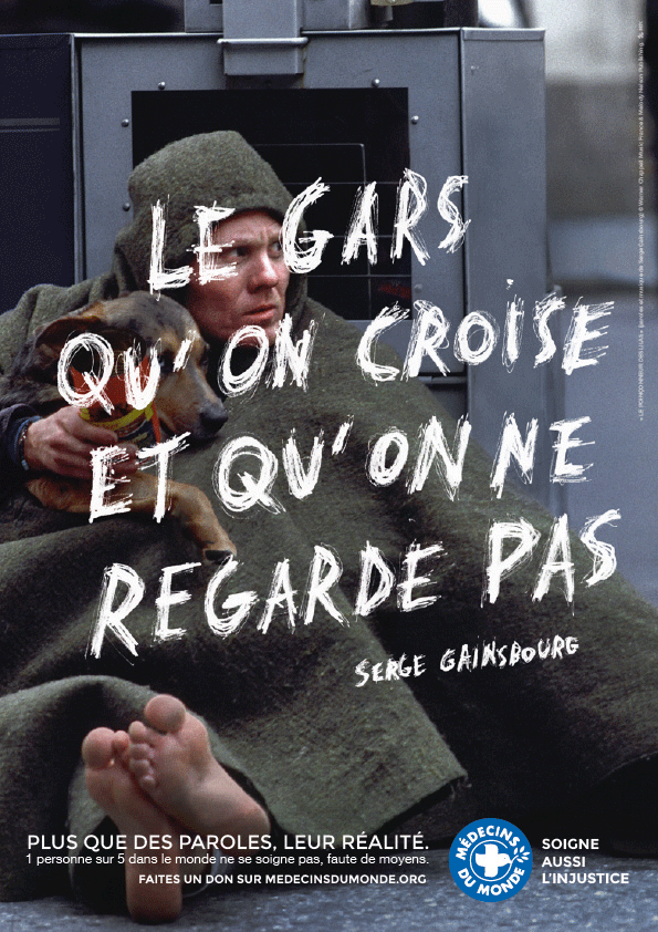 Conçue avec le soutien de trois grandes figures de la chanson française – Maxime Le Forestier, le groupe IAM et les ayants-droits de Serge Gainsbourg – la série d’affiches, de films et de spots radios redonnent aux paroles de chansons populaires et engagées toute leur profondeur en les confrontant à la dure réalité des personnes démunies.