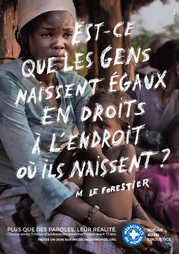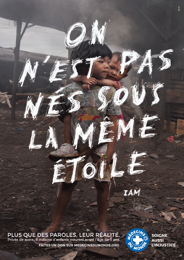 « Est-ce que les gens naissent égaux en droits, à l’endroit où ils naissent ? » C’est la question que pose une jeune femme enceinte à travers la chanson de Maxime Le Forestier. Les paroles de Serge Gainsbourg nous interpellent sur « le gars qu’on croise et qu’on ne regarde pas », ce sans-abri auquel les équipes de Médecins du Monde viennent chaque jour en aide. Enfin, le groupe IAM nous rappelle à travers « On n’est pas nés sous la même étoile » que l’injustice qui frappent beaucoup d’enfants à travers le monde demeure.