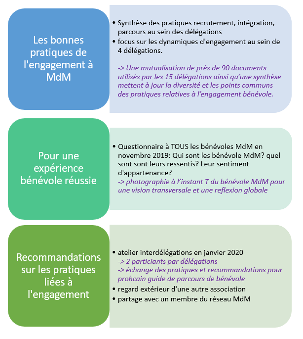 Suite à la priorisation des dossiers Vie associative par les délégations régionales et des groupes géopolitiques fin 2018, un chantier sur l’engagement bénévole a démarré en 2019. Il s’intègre dans les priorités DG / Horizon 2025 « 1.2 Promouvoir l’engagement et la militance » / priorités directeurs (2019-2021) « Réaliser une capitalisation sur la motivation et l’engagement bénévole et les leviers d’action possible sur lesquels MdM peut influer »