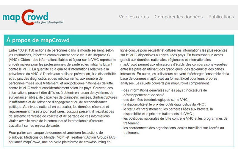 Médecins du Monde et Treatment Action Group (TAG) lancent le mapCrowd, un outil innovant et inédit pour mesurer l’état de l’accès aux diagnostics et aux traitements de l’hépatite C au niveau mondial. En lien avec le site internet hepCoalition.org, le mapCrowd propose de fournir un aperçu en temps réel de la disponibilité et de l’accessibilité des différents tests, diagnostiques et médicaments anti-VHC, ainsi que des données épidémiologiques et des politiques publiques de lutte contre l’épidémie.