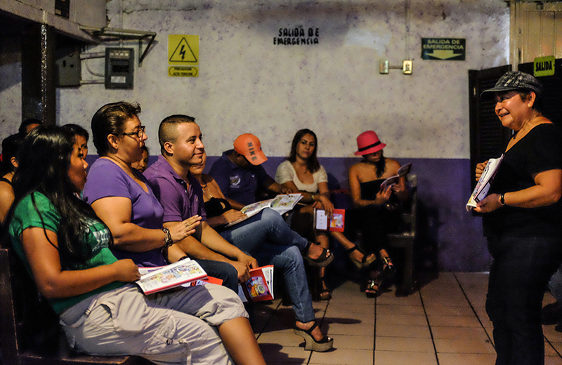 tout le monde répond présent, du DJ au cuisinier. En plus du réel intérêt pour les conseils de santé et de sécurité, on sent le besoin d’une bouffée d’air frais. Une brochure distribuée gratuitement sert de support à la formation, comme à l’école. Brigada publie ses fascicules sous forme de BD stylisée pour les personnes qui ne savent pas lire. Un point remarquable mérite d’être souligné au regard des débats qui sévissent un peu partout dans le monde, notamment en France à la veille du vote de la nouvelle loi de prostitution : au-delà de la santé, les formations dispensées par Brigada aident les femmes à connaître le droit du travail et à faire respecter les leurs auprès de leurs divers employeurs. Et par là même à reconnaître les signes de la traite, qui s’appuie souvent sur des manipulations et des menaces auprès de personnes trop vulnérabilisées pour être lucides.