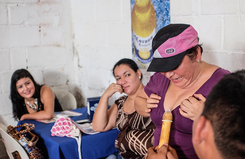 Les ateliers animés par Elvira dans les bars sont tout simplement incroyables. On ne peut pas reprocher à cette sociologue qui a mis toute sa vie au service de la protection des travailleuses du sexe de se retrancher derrière la théorie ! Sa voix grave et rocailleuse, ses blagues dont elle rit à gorge déployée, ses conseils pragmatiques et ses démonstrations sans chichis (mettre une capote avec la bouche ou avec les seins, simuler un rapport sans pénétration…) font directement mouche. Un modèle du genre qui pourra servir de référence à tous nos programmes en France et à l’international.
