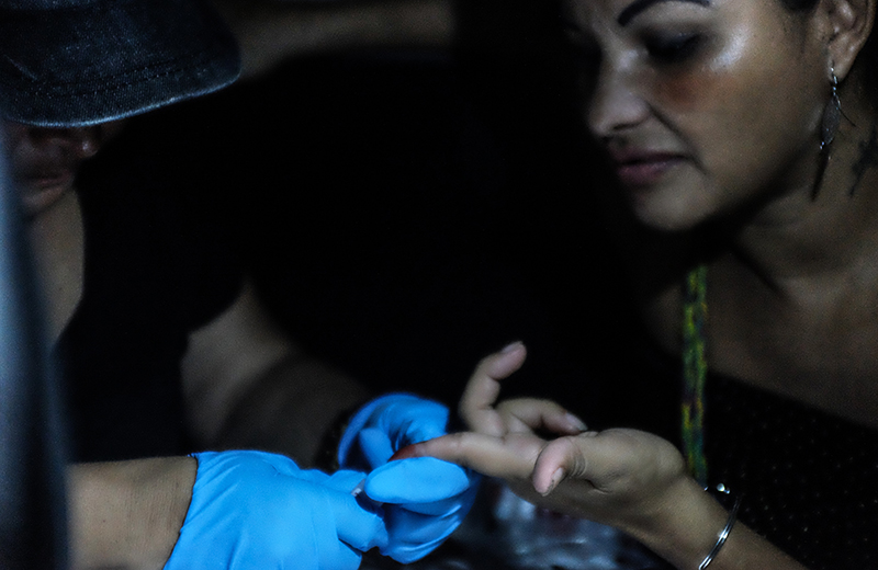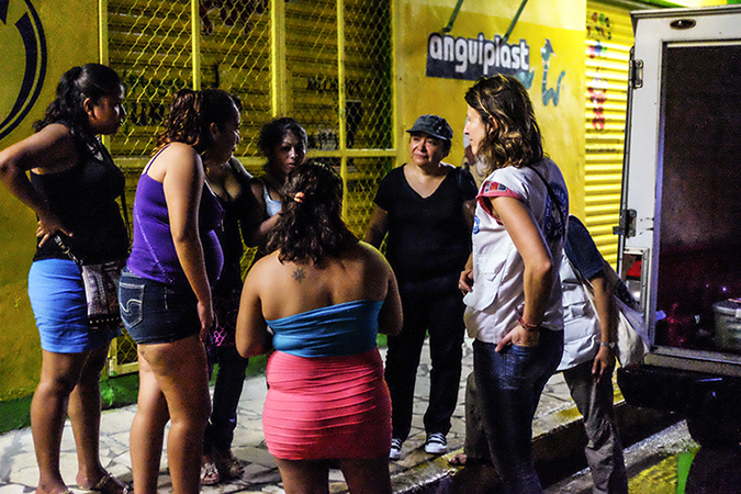 pas s’éloigner, rester groupés… Rien n’est gagné d’avance mais le contact se fait, souvent grâce à la réputation de notre programme. L’approche humaine, simple et directe de toute l’équipe y est aussi pour beaucoup. Les femmes sont heureuses que l’on vienne leur parler et leur donner des préservatifs. La plupart d’entre elles passent le cap angoissant du test de dépistage. Une jeune Salvadorienne s’évanouit après la piqûre, une autre saigne du nez. La lecture de leurs résultats négatifs les requinque dans la minute. La moyenne d’âge semble tourner autour de 20 à 25 ans, pourtant sur la fiche de tournée on lit 30, 35 ou même 40 ans. Une blague ? Oui, un peu, mais surtout « j’espère ne plus être ici à cet âge-là » confie l’une d’entre elles.