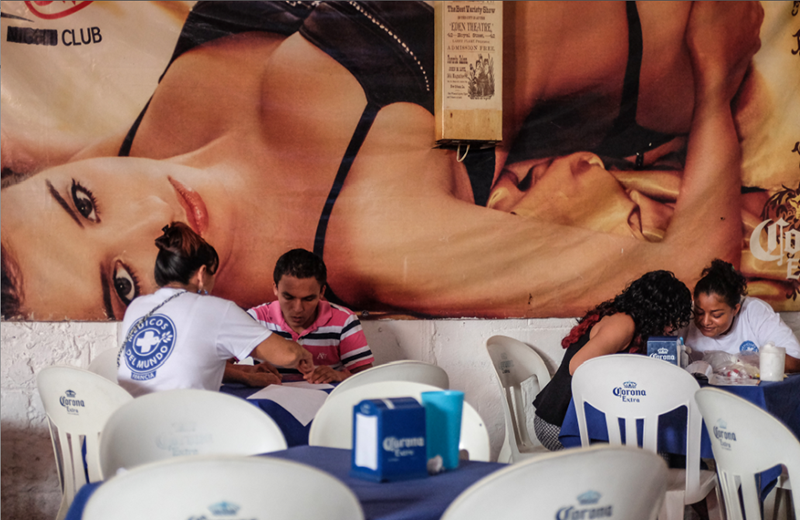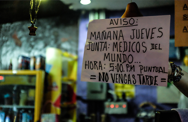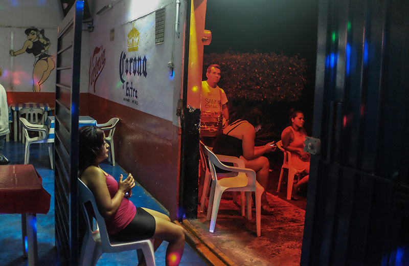 Les ateliers sont suivis des distributions de gels et de préservatifs puis des tests de dépistages, assurés par toute l’équipe, très bien rôdée : deux ou trois promotrices, Elvira et Jaime, Frédérique et Betty, Brenda et Sagrario. L’implication humaine de cette mère de famille initialement recrutée pour un travail administratif en dit long sur l’empathie que génère la situation des travailleuses du sexe ici. Les lieux sont parfois franchement sinistres mais notre groupe est généralement bien accueilli, les espaces sont aménagés : des chaises pour la formation, des tables pour les tests. Dans un des bars, le DJ diffuse en boucle des standards de la chanson française pour nous remercier !