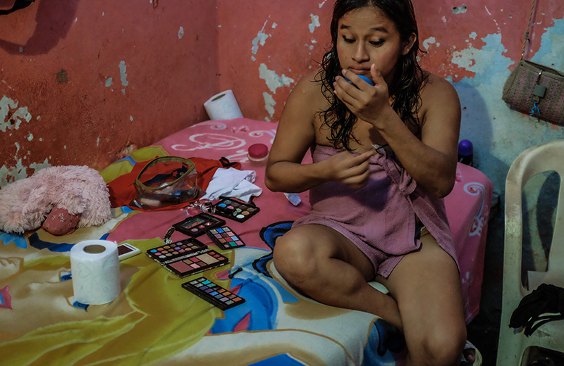 Les entretiens, parfois interrompus par un client, sont durs, très durs. La pudeur n’a pas sa place au milieu d’un centre de consommation. Les femmes sont tristes, le disent et pleurent au micro. L’objectif de Myrian, 31 ans, ici volontairement, est de reprendre les études paramédicales qu’elle avait entamées au Salvador, financées par l’État. Aujourd’hui elle doit envoyer de l’argent à ses deux enfants et à sa sœur qui souffre d’un cancer du sein. Sur son corps, trois tatouages : un cœur transpercé qui représente l’amour de ses petits qu’elle ne peut plus voir, une fleur qui lui donne de l’espoir et un trèfle pour appeler la chance. Rosie, ici depuis la mort de son père, pleure de douleur même si « au moins ici, on n’est pas obligées de boire et de fumer pour travailler »… Yesenia nous répond très gentiment mais un client vient de passer, elle est complètement « ailleurs ». Elle a trois enfants et nous dit qu’elle doit aller chercher à l’école et qu’ils habitent avec elle dans cette triste chambre… on sait que c’est faux mais on ne dit rien… Comment ne pas perdre la tête dans un cadre pareil ?