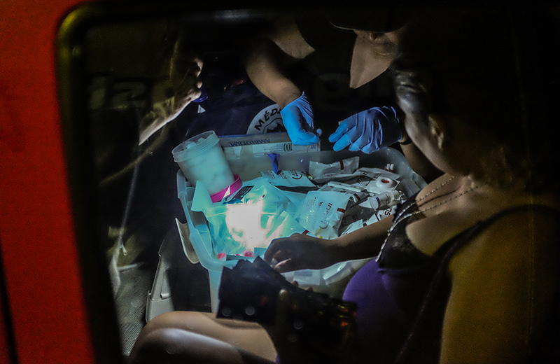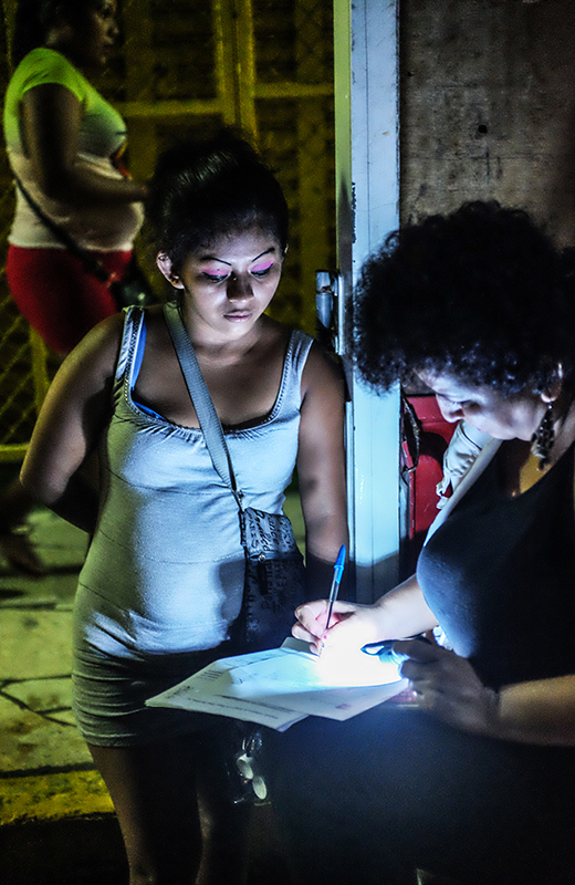Notre tournée débute au coucher du soleil, premier arrêt dans la 6 è rue où Carina travaille « depuis toujours ». L’énergie et l’humour de cette belle femme de 33 ans, née ici, font plaisir à voir et à entendre. Mère de 5 enfants très fière de son indépendance, elle assume totalement son métier connu de tous. « Les autres femmes se font baiser tous les soirs par leurs maris et sont payées tous les 15 jours*, alors que moi je suis payée tous les jours ! » raille-t-elle. Carina a commencé à travailler dans un bar à 14 ans, c’est un très mauvais souvenir, elle préfère la rue. Elle ignorait tout des maladies sexuellement transmissibles d’où sa grande reconnaissance envers l’équipe de MdM qui a su venir lui parler et la mettre en confiance. Ses pratiques ont radicalement changé, elle deviendrait promotrice si son emploi du temps le lui permettait. Elle se lève à 5 heures du matin pour s’occuper de ses enfants et finit son travail dans la rue vers 21h00…