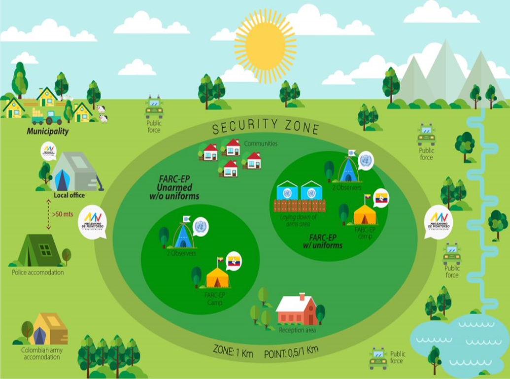 Il est prévu dans l’accord que les FARC rendent leurs armes à l’ONU dans le cadre du mécanisme de monitoring et de vérification dans les ZVTN, et que le gouvernement y garantisse la couverture des besoins élémentaires (tels que l’hébergement, la protection, la santé et l’alimentation). Ces zones sont prévues pour une période de 180 jours.