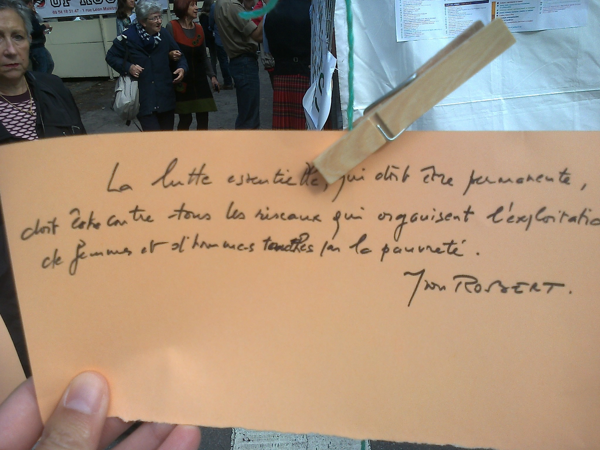 Prenez donc un portique à vêtement classique, du fil, des pinces à linge, du papier et des feutres ainsi qu’une bonne dose d’enthousiasme, et c’est parti ! A l’assaut de l’espace public! L’atelier mobile interpelle, des regards curieux s’attardent, Monsieur le Maire et des élus politiques sont nos premiers interlocuteurs, puis gravitent de plus en plus de personnes qui se questionnent sur ce que nous faisons et qui finissent par mordre à l’hameçon.
