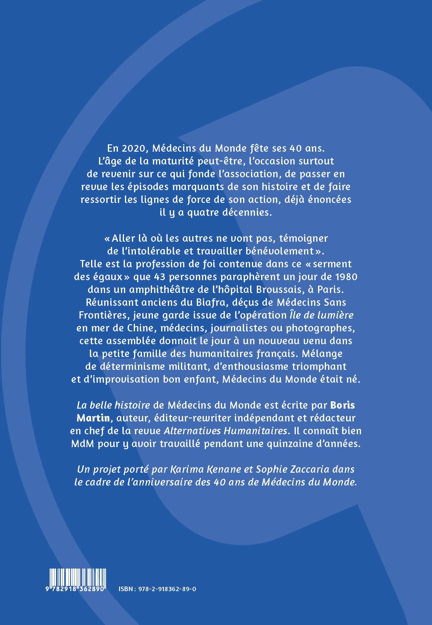 En 2020, Médecins du Monde France fête ses 40 ans d’existence. À cette occasion, nous nous sommes lancés dans le projet d’écrire un livre qui raconte l’histoire de notre association et retrace, à travers le parcours de femmes et d’hommes engagés, le chemin parcouru depuis sa création. La « belle histoire » de Médecins du Monde est écrite par Boris Martin, auteur, éditeur-rewriter indépendant et rédacteur en chef de la revue Alternatives Humanitaires. À « déguster » sans modération au bord de la mer, à la campagne ou en montagne …