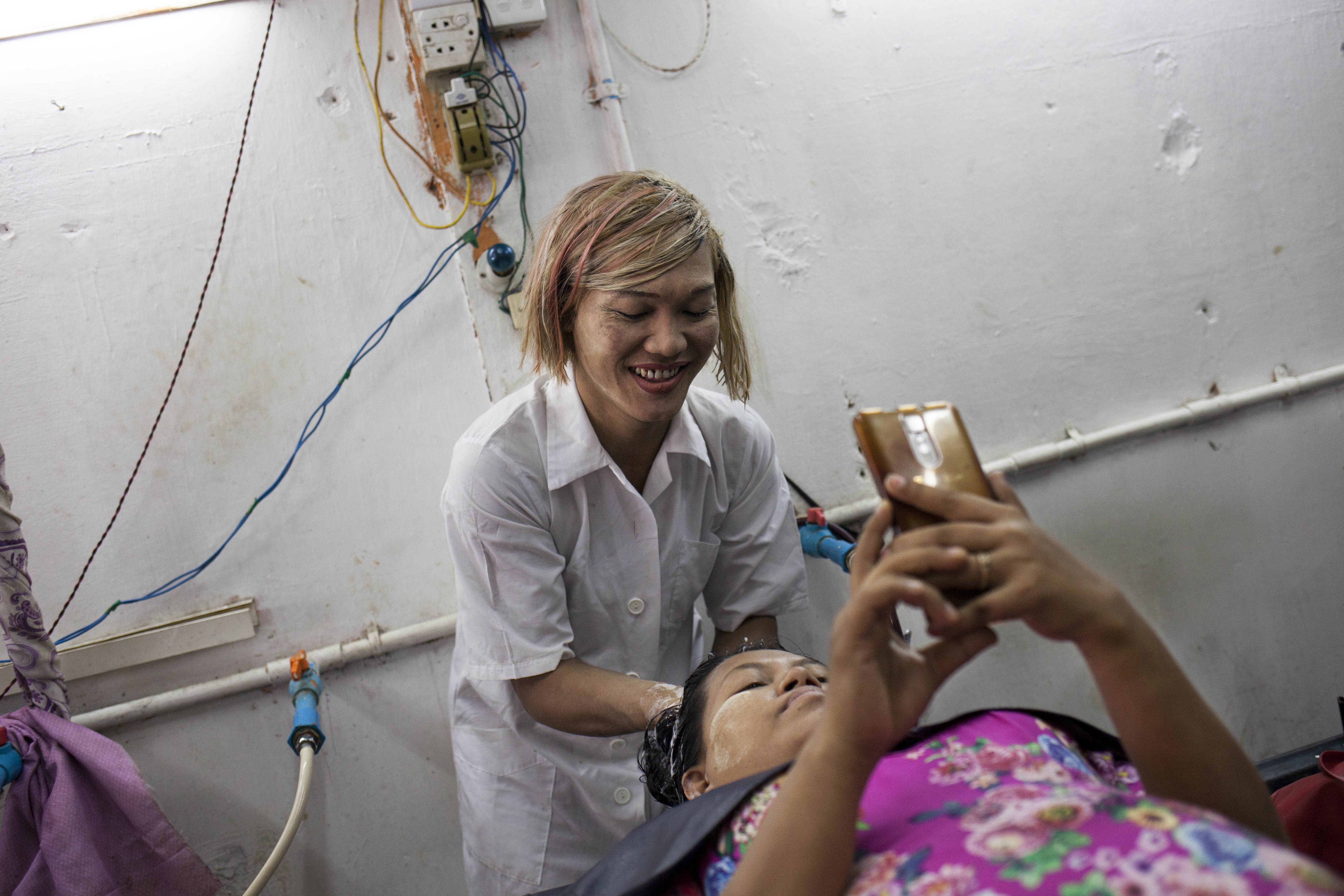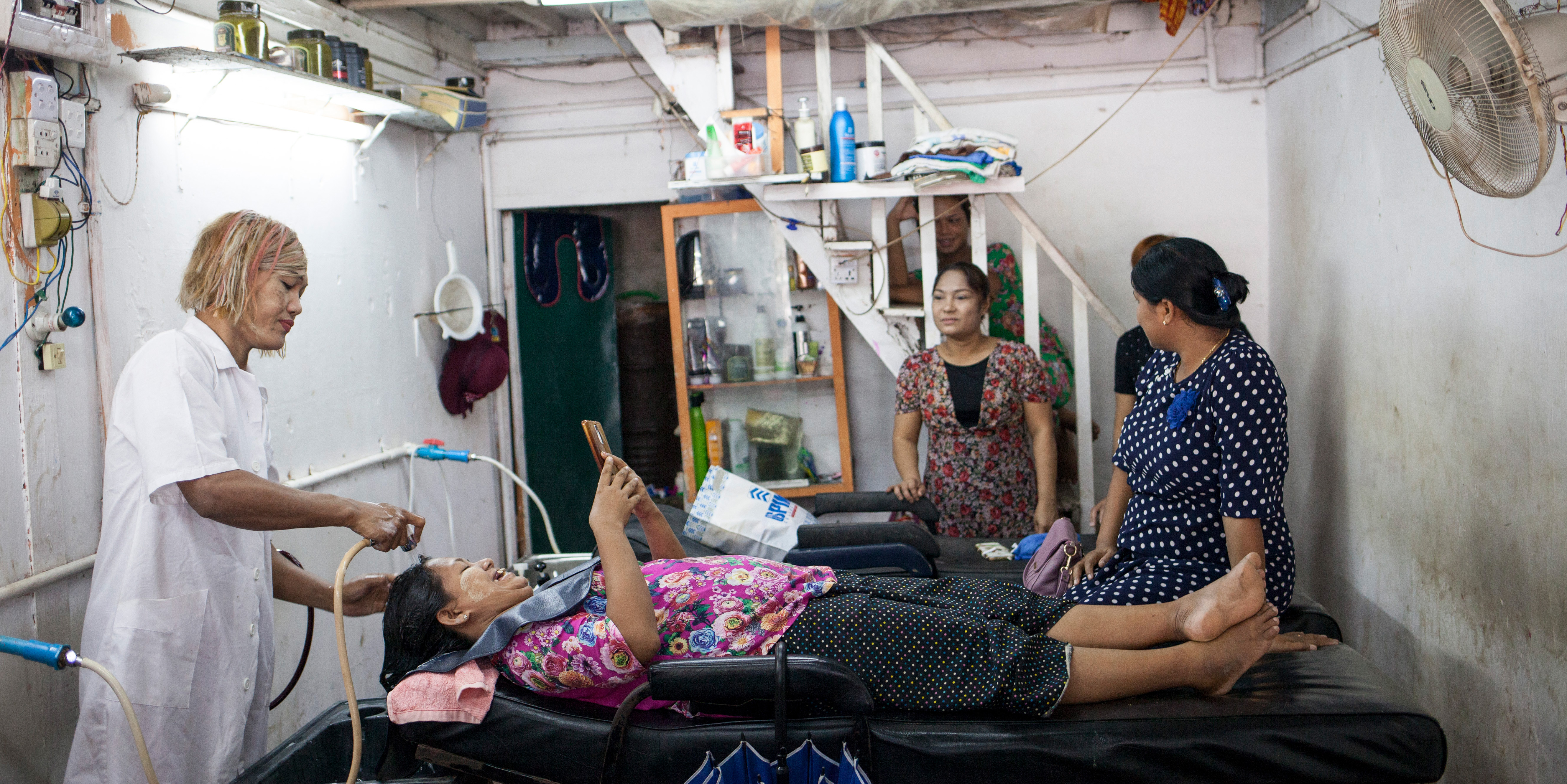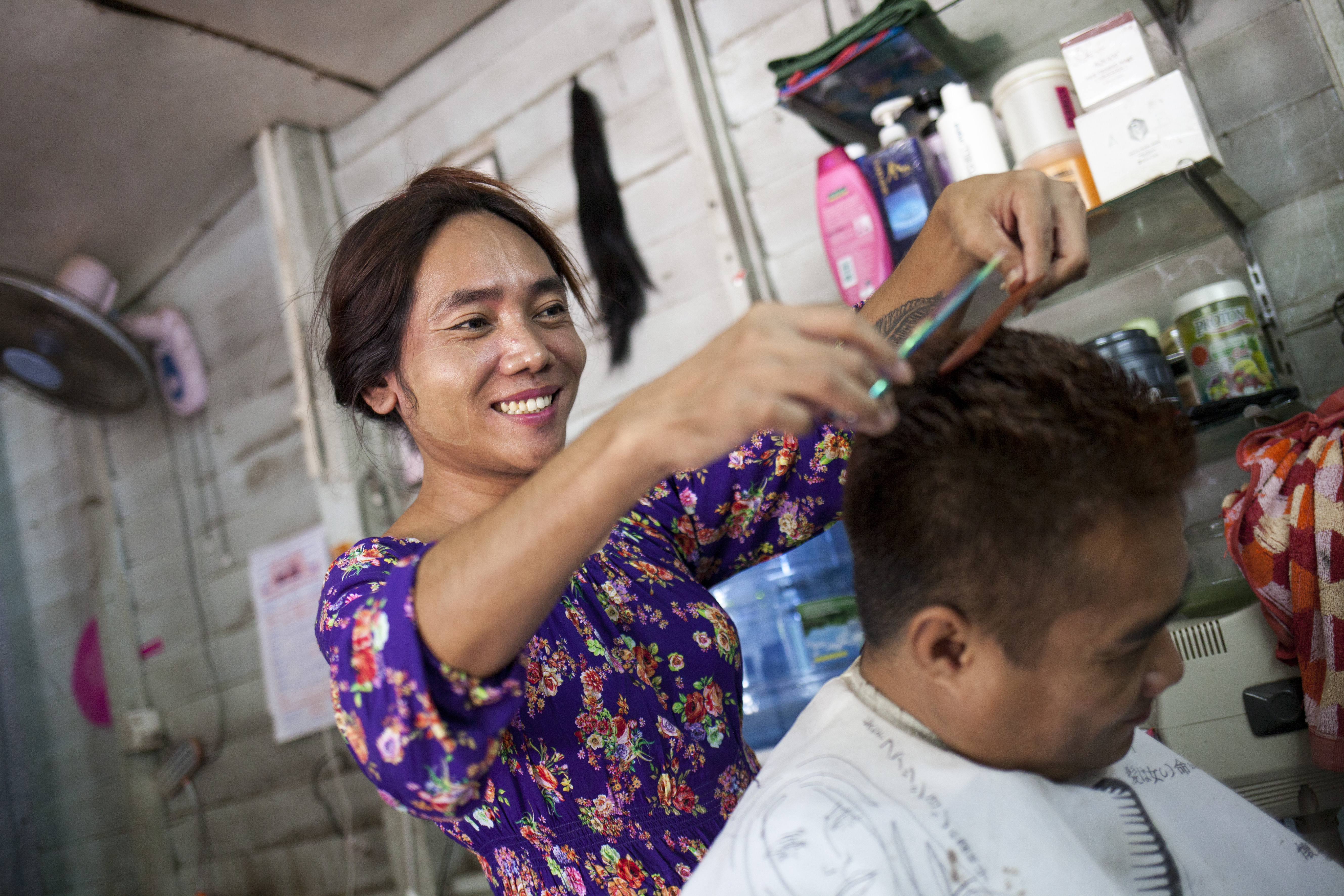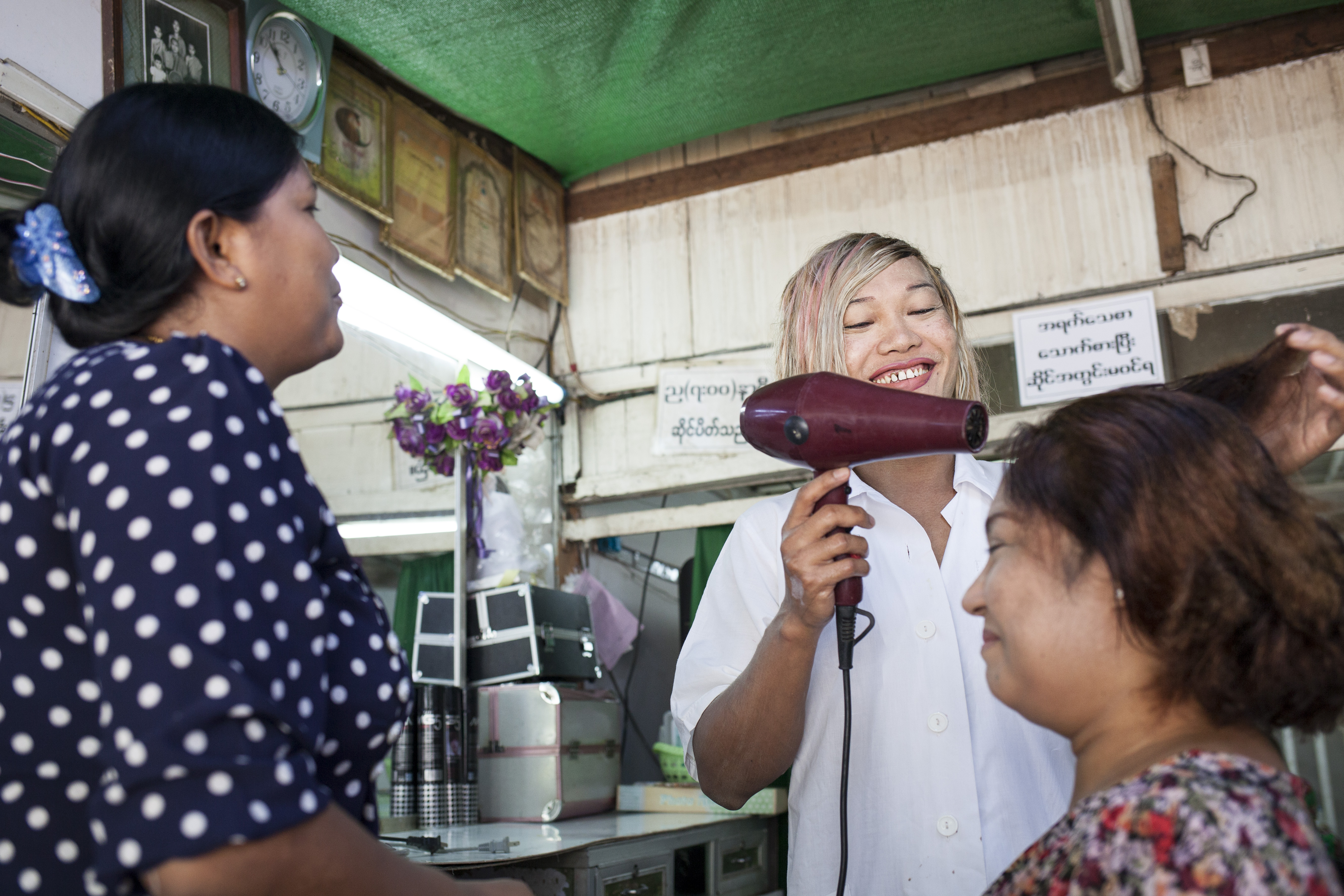 Pour mener à bien leurs mission de préventions des risques, les équipes de terrain de MdM sont en lien avec des personnes ressources du territoires qui appartiennent à la population concernée : des membres de la communauté HSH, des propriétaire de bars, de salon de massages ou de soins. Au Nord de Yangon, nous rencontrons Shine, quarante-six ans, propriétaire d’un salon de coiffure.