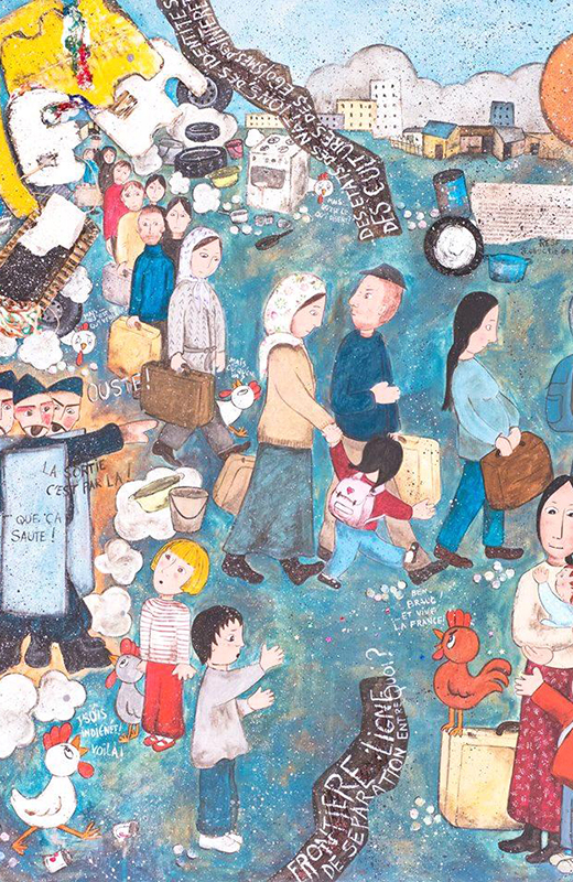 Avant même de connaître cette association, je peignais déjà sur les Roms. J’avais entendu qu’il y avait de nombreuses expulsions en 2011 et j’ai voulu peindre sur ce sujet. Lors d’une exposition de peinture, une personne de C.L.A.S.S.E.S a vu mes peintures et m’a directement contactée. Depuis je me suis investie dans cette association et je me base sur ce que je vis pour mes nouvelles peintures.