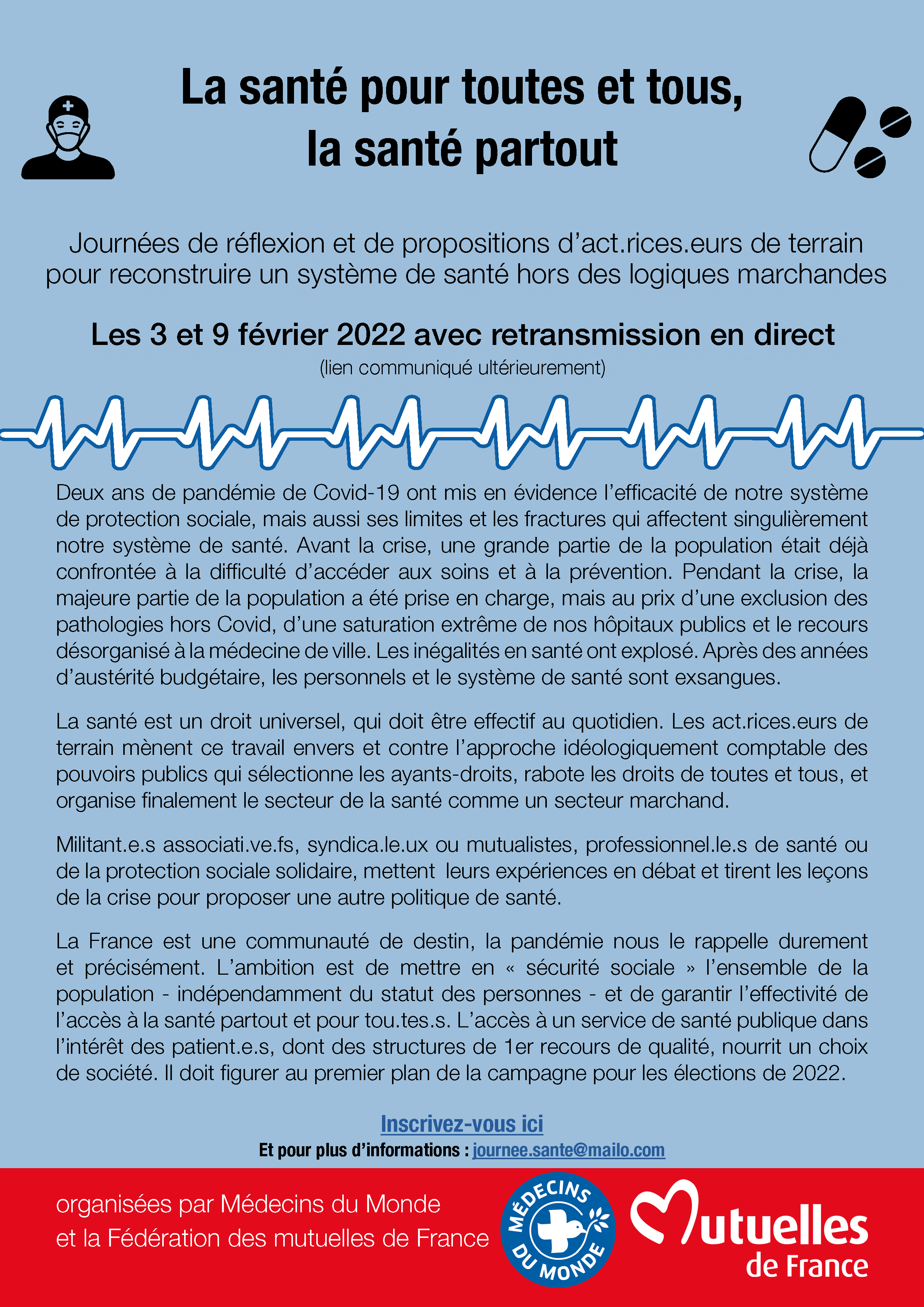 Face à l’aggravation des inégalités sociales et territoriales de santé, face à une crise du système de santé aggravée par la crise covid, Médecins du monde et la Fédération des acteurs de la solidarité ont réuni différents types d’act.rice.eur.s, professionnel.le.s de santé, observat.rices.eurs, associations, mutualistes, pour partager leurs réflexions et propositions, mettre la santé à l’ordre du jour de la campagne électorale et dépasser l’instrumentalisation de populations boucs émissaires.