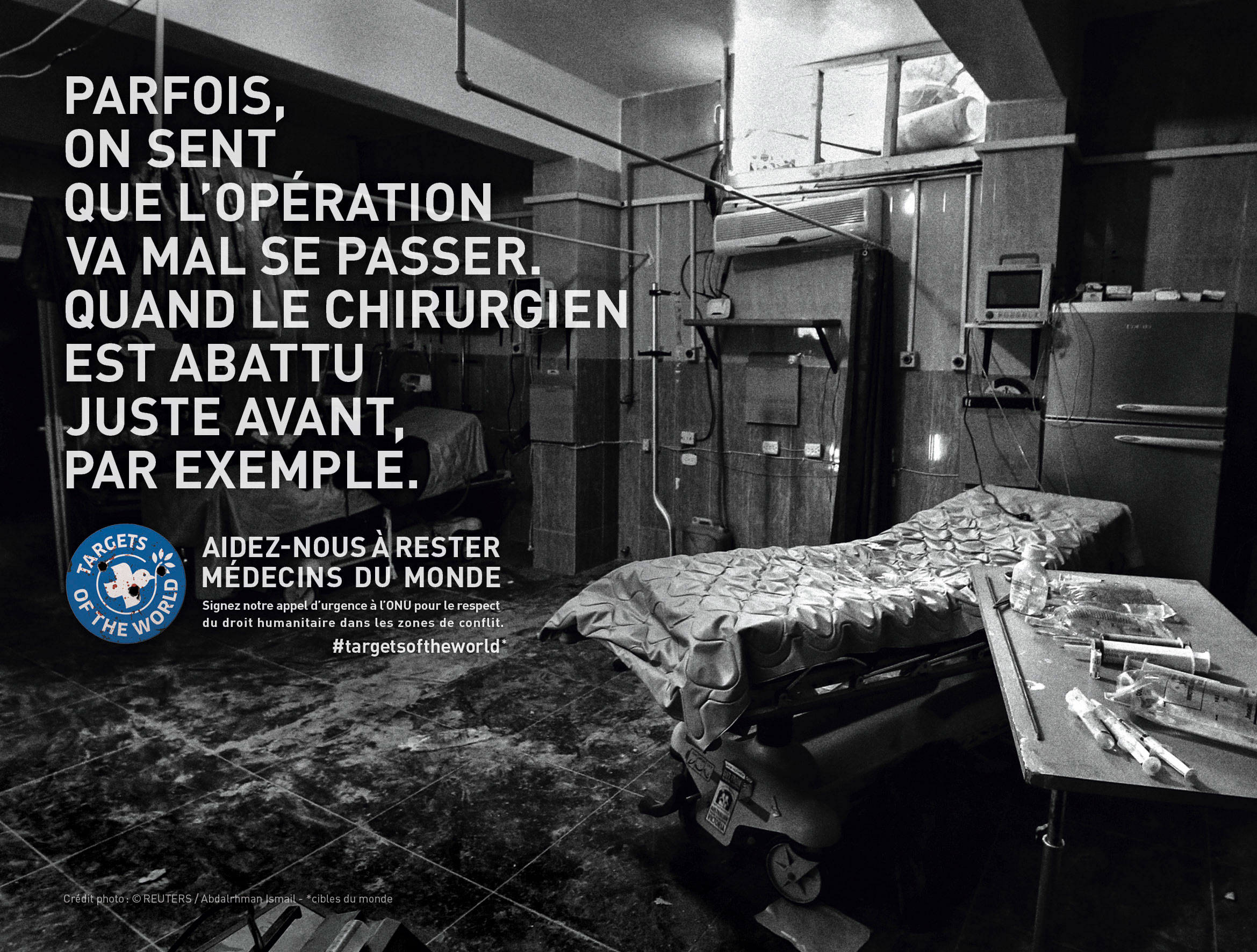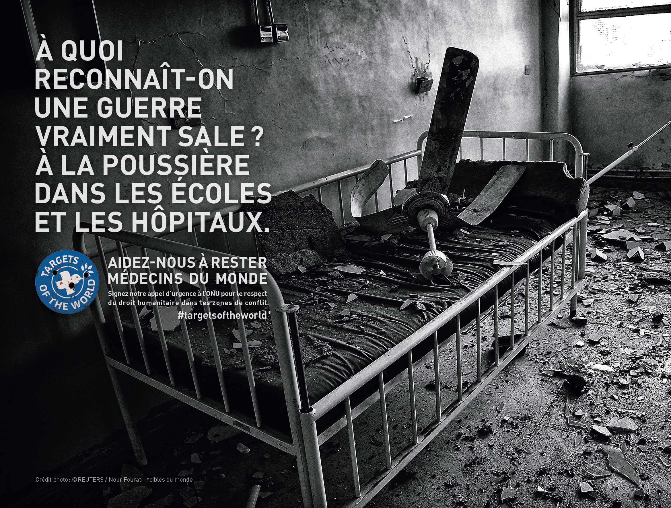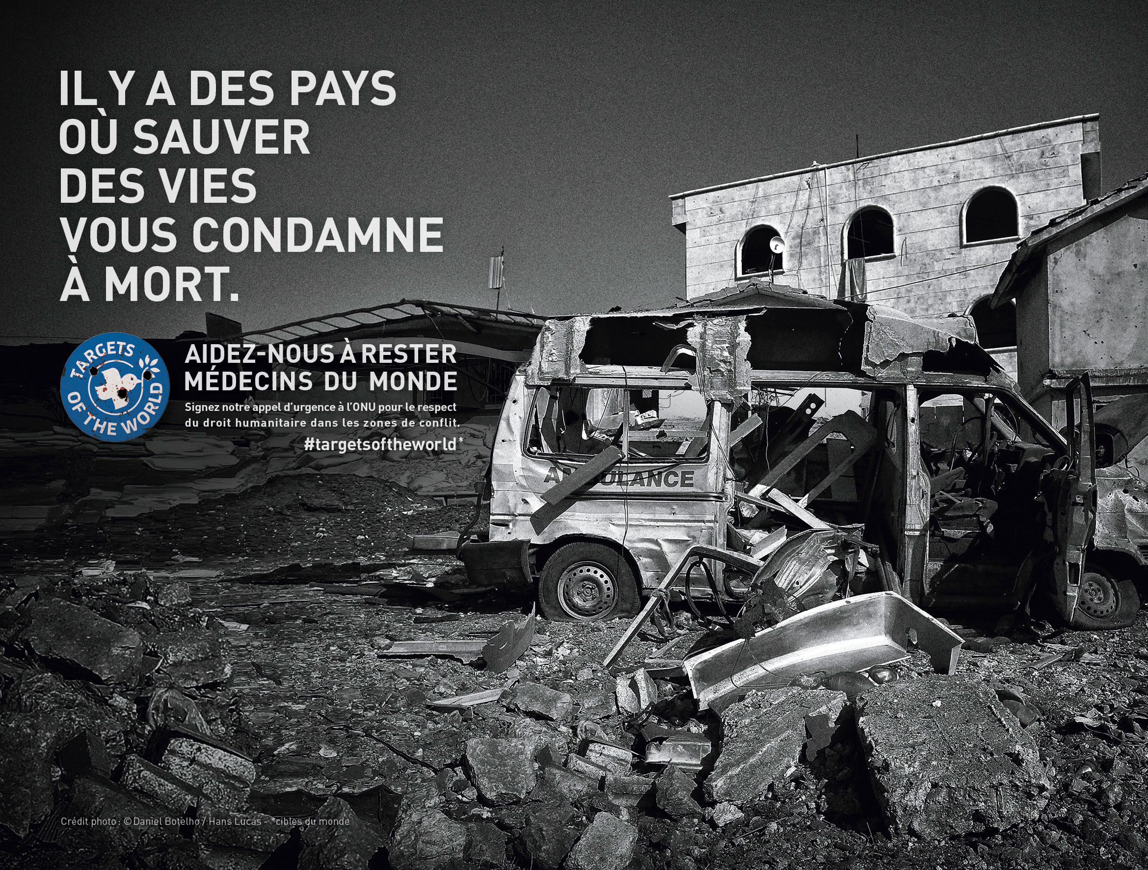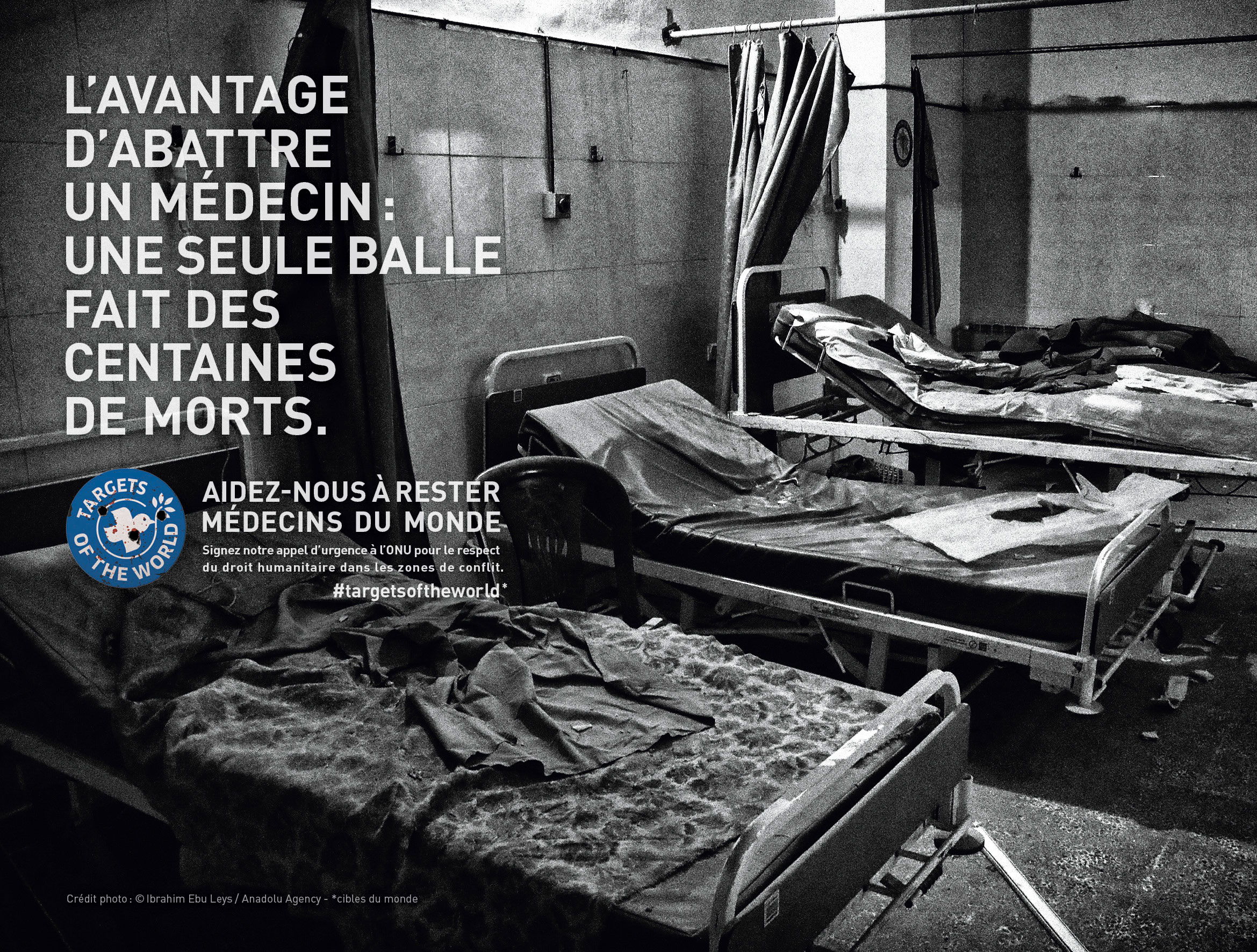 MdM devient une cible, d’où l’idée de détourner notre logo en Targets of the World, demandant au public de nous aider à rester Médecins du Monde. Les soignants doivent rester des soignants. En vertu du droit humanitaire, ils doivent être épargnés des conflits, les structures de santé doivent être protégées et en aucun cas ciblées de manière délibérée.
